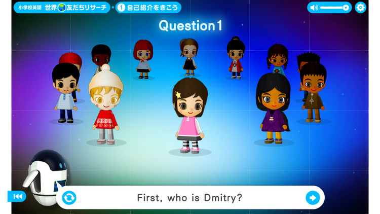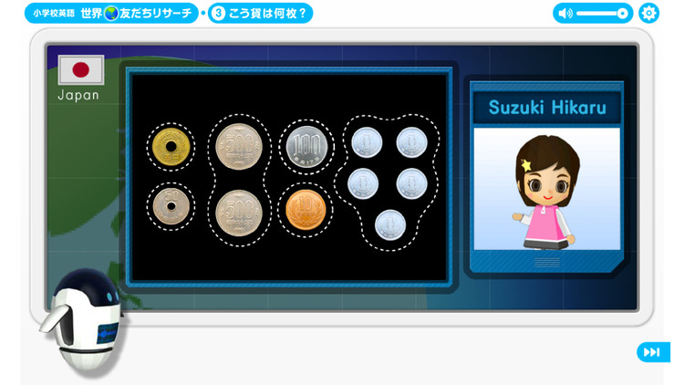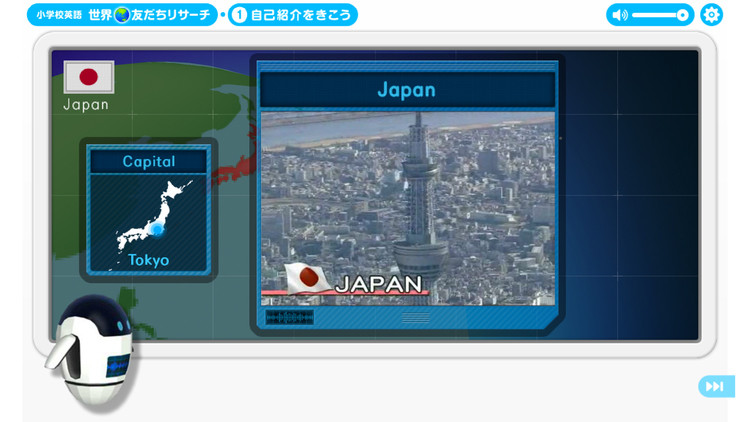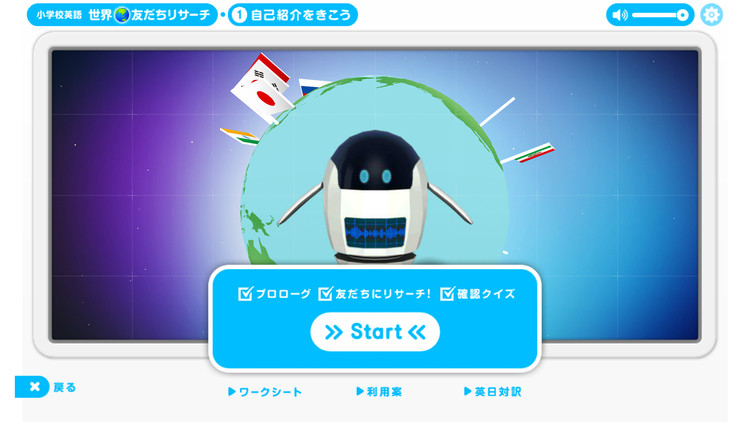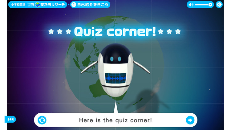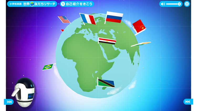 先生のアシスタントであり、コンテンツのナビゲーターロボットのアンディーと一緒に世界の子どもたちと会話をしながら、各国の文化に触れ英語を学ぶものになっています。教室で使われる大型画面教材であることから、楽しんで触れられる教材になるために、3Dの地球をまわして各国の子どもと会話できるナビゲーションを採用。