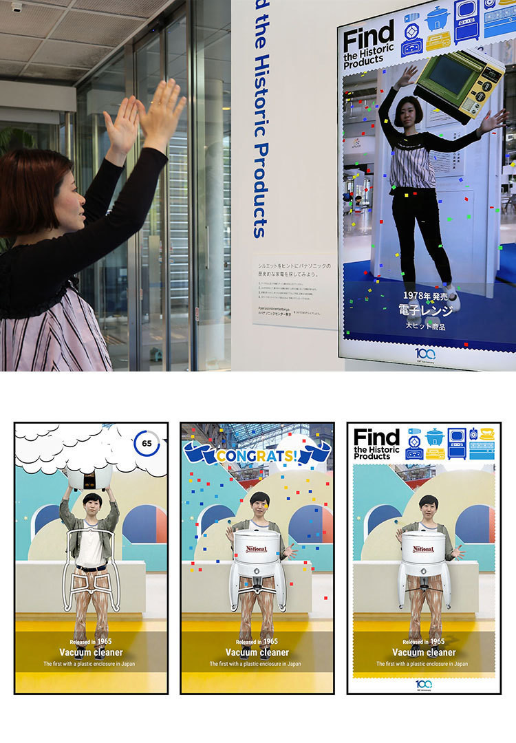 モニターの前に立つと製品のシルエット・名称・発売年などが表示され、そのシルエットを頼りに頭上に現れる雲の中から製品を見つけ出します。正解の製品を見つけ出すと写真を撮られ、QRコード経由でその写真を持ち帰ることが可能です。あえて正解の製品を見つけやすくたくさんヒントを提示するのではなく、繰り返し雲の中から製品を取り出してもらうことで色々な製品に触れる機会を作りました。