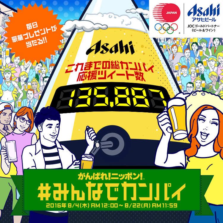 日本代表選手団を応援するためのビールを、Twitter上に巨大なビールサーバーで用意。応援メッセージと「#みんなでカンパイ」タグをツイートすると、巨大なビールサーバーのビールが減っていきます。みんなで飲み終えると、ツイートした人の中から毎日抽選で豪華商品が当たります。参加ユーザーには、応募完了のお知らせと現在のカンパイ数通知を兼ねて、アサヒビールのCMのように、自分が大勢の観客がいるスタジアムの中心でカンパイの音頭取りになったかのようなグラフィック画像を返信ツイートでお送りしました。