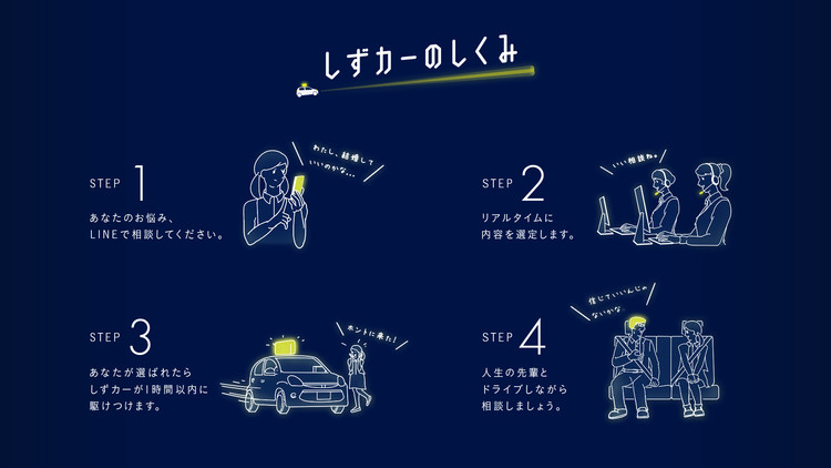 日常の最も身近なツールになっているLINEの、トヨタ公式アカウントから相談すると人生の先輩が乗ったパッソ"しずカー"がユーザの元へ駆けつけドライブしながら、お悩みにこたえていきました。