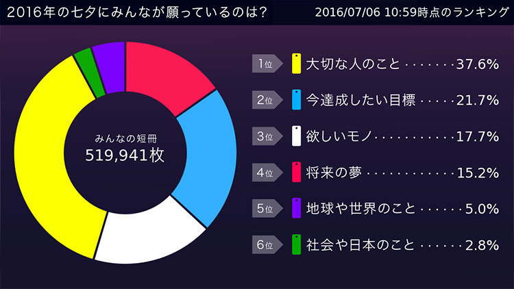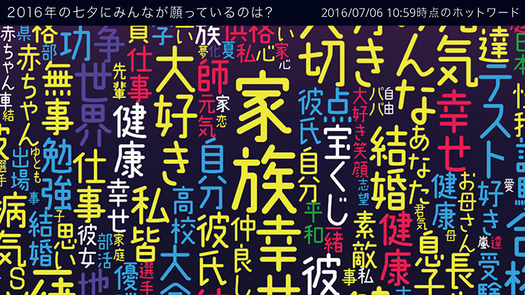 7/7時点で集まった短冊は70万枚以上。短冊のデータを詳しく見ていくと、さまざまな気づきがあります。 ホットワードには、【熊本】【EU】など、2016年の今ならではの言葉も多く登場しました。その年、人が何を願ったかは、まさにその時代をうつす鏡だと思います。このプロジェクトはまだ始まったばかりですが、来年、再来年と継続して、「願い」という価値あるデータを毎年アーカイブしていくことを目指しています。そして将来、七夕という行事が、国内だけでなく世界中の願いが集まる日になることを夢見ています。/佐藤まゆみ