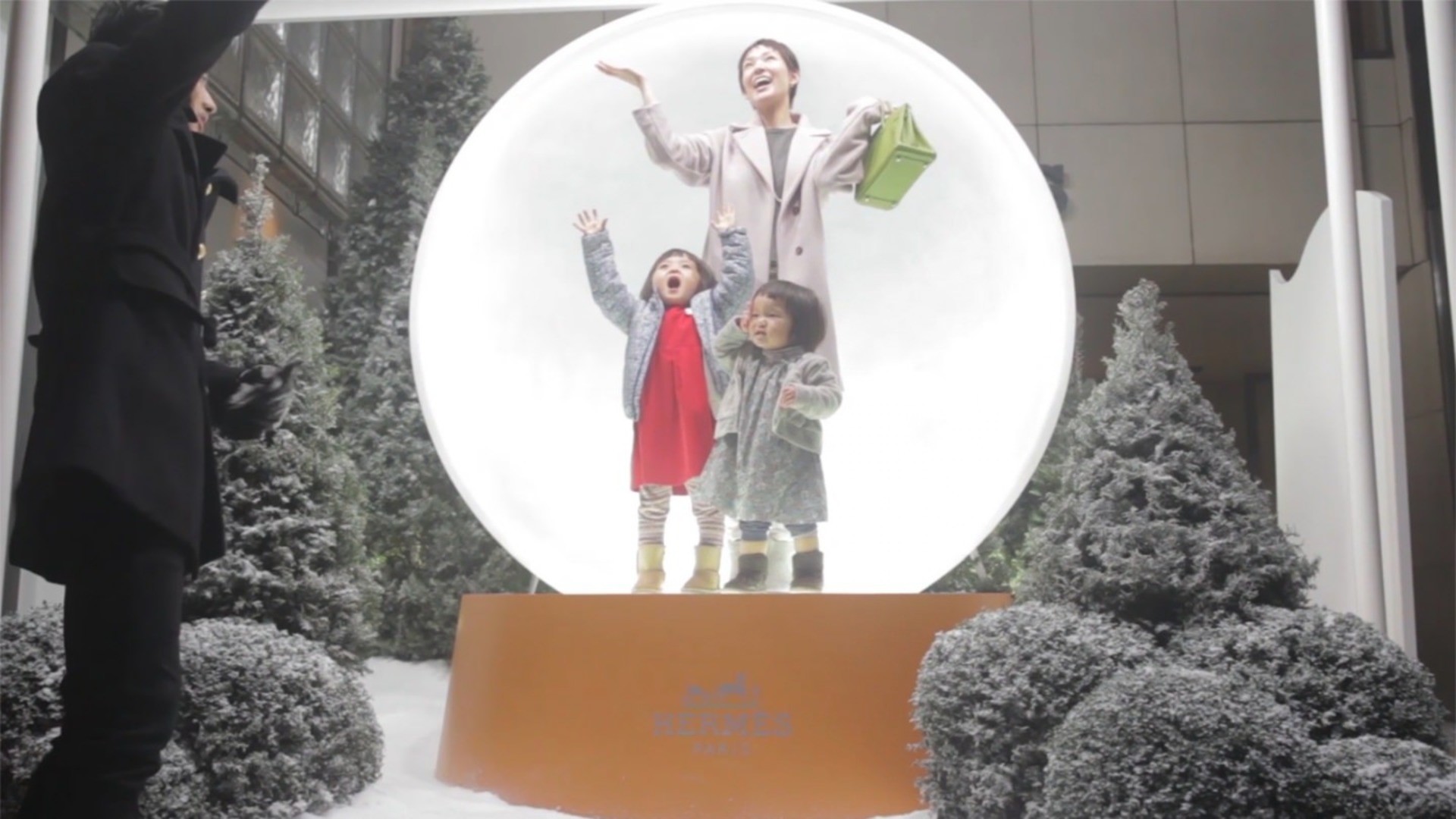 We held offline participation type event. Established photo stage which set 12 cameras at HERMES Ginza shop and Midosuji shop. Participants took photo on this photo stage and these photos are set in the HERMES special digital snow dome automatically.