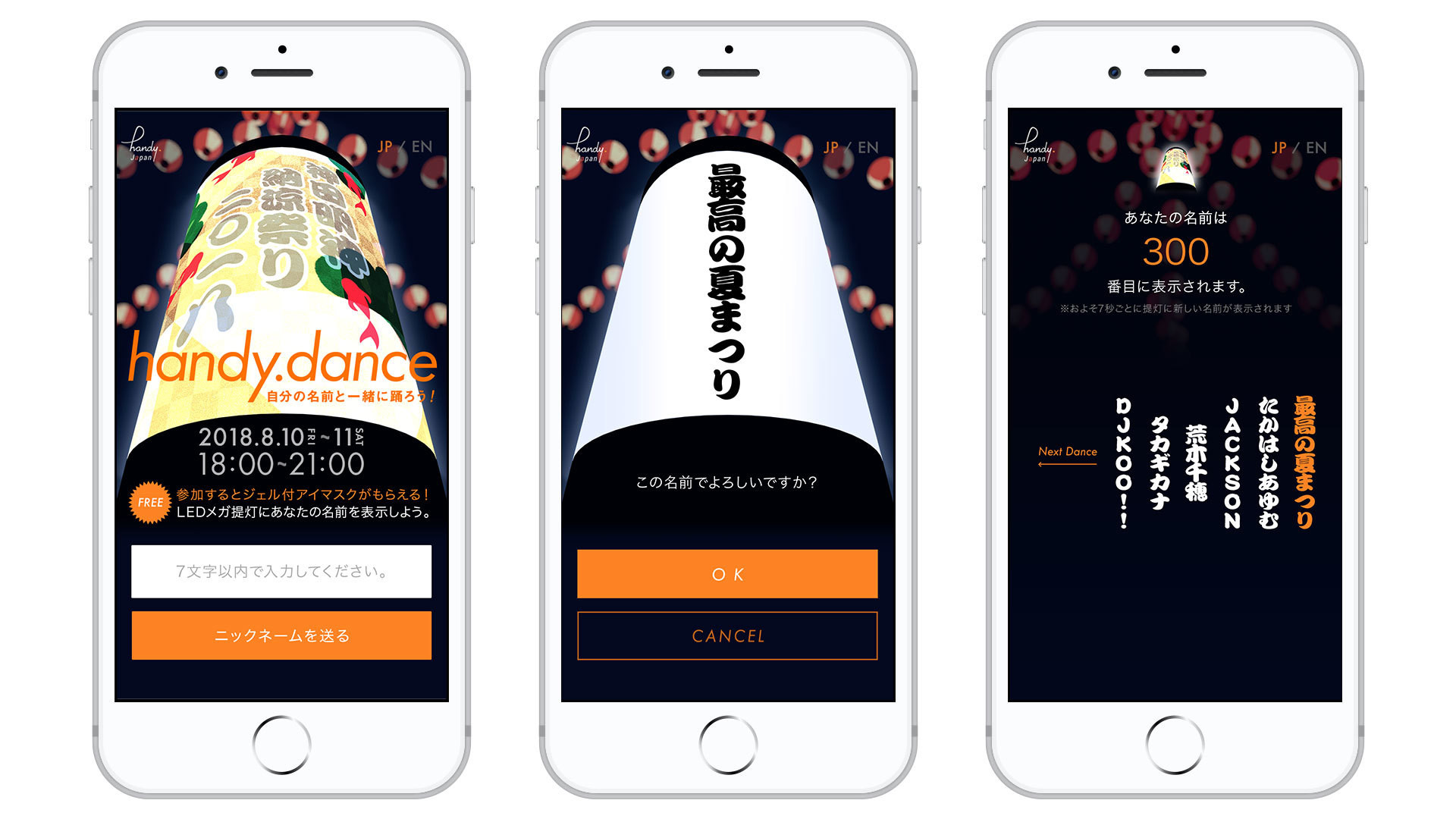 提灯を模した巨大なLEDを設置し、祭という大舞台で自分の名前を表示するという特別な体験を可能にするコンテンツ"handy.dance"を企画開発しました。