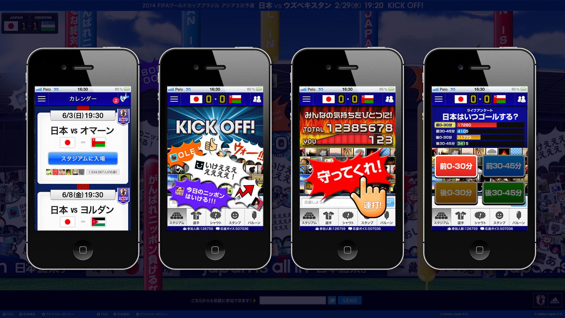 また、試合の状況によって使い分けられる応援スタンプやバルーンも用意しました。同時にFacebook、Twitter、mixiにもフィードされる仕組みになっています。現在進行形で行われている試合に合わせてPKやゴールなどのゲーム状況をアプリ上に表示したり、ここ一番の正念場でみんなの気持ちをひとつにする「みんなでシャウト」、みんなの声をリアルタイムに集計する「ライブアンケート」、結束バルーンをゲットできる「ハーフタイムチャレンジ」など、みんなで盛り上がることができるイベントも用意しました。PCサイトではスマートフォンから送られた応援を集めてリアルタイムにビジュアライズしました。試合が行われている時間に合わせて、スタジアムの絵も昼間、夕方、夜の背景に変化します。